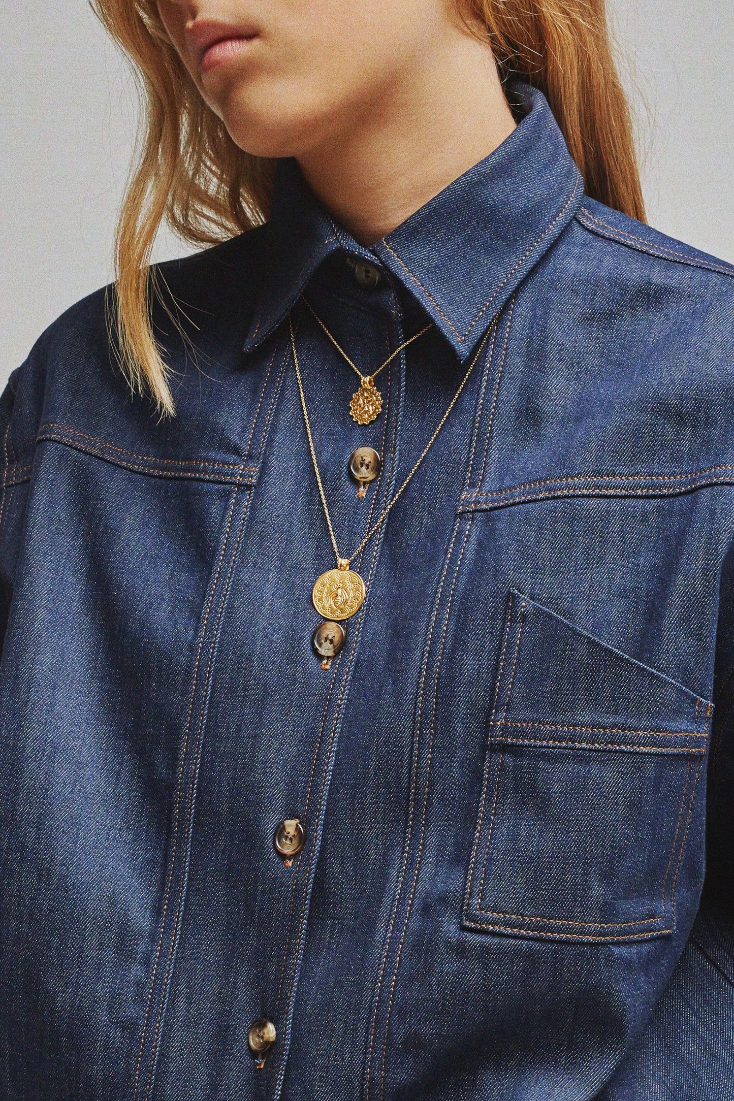 DOMITILLE 2 is a round vermeil pendant decorated with a swallow. The motifs inside the medal are engraved by hammering.